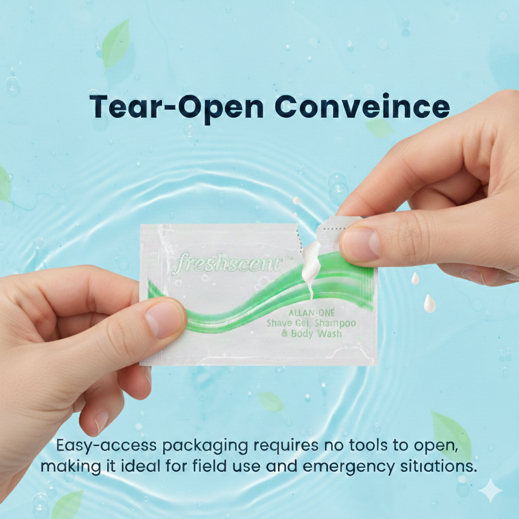 Perfect for disaster relief kits, homeless outreach, and emergency ""Go-Bags,"" these sachets provide the dignity of a full-body clean without the bulk of traditional bottles.