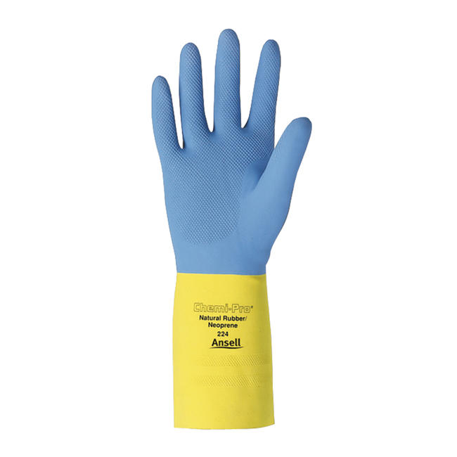 Chemi-Pro Natural Rubber Latex & Neoprene Gloves offer superior chemical resistance and durability. The unique blue and yellow gloves feature a 27-mil thickness for rugged protection against physical hazards and a recessed diamond-embossed pattern for added grip on wet or dry surfaces. Combining neoprene over natural rubber latex, these gloves provide increased protection against a wide range of chemicals, making them ideal for chemical processing, cleaning, and plant maintenance. Available in small size.