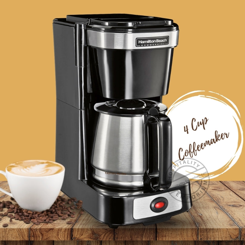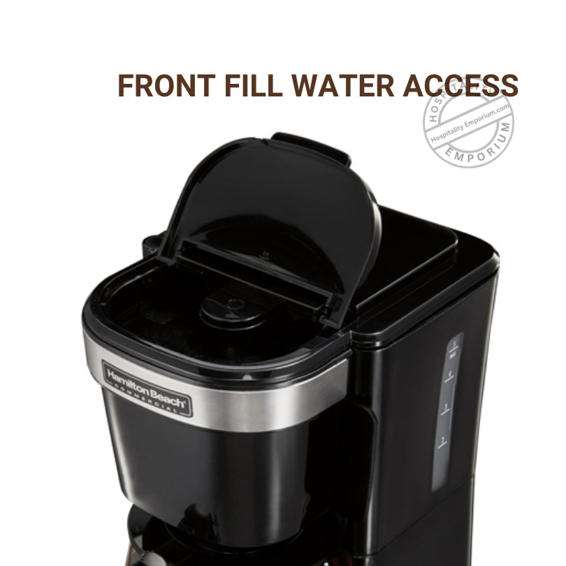 Mejore la experiencia de café de sus huéspedes con la cafetera comercial de 4 tazas de Hamilton Beach. Esta elegante cafetera negra, complementada con una jarra de acero inoxidable, está diseñada para brindar comodidad y calidad. La jarra de vidrio puede contener hasta 4 tazas de café, lo que la hace ideal para uso personal o compartido. Con una canasta de preparación abatible, es perfecta para bolsas de café y de fácil acceso para la limpieza. La placa de calentamiento antiadherente garantiza que el café se mantenga caliente hasta 30 minutos antes de que se active la función de apagado automático para mayor seguridad y eficiencia energética. La función de pausa y servicio permite a los huéspedes servir una taza a mitad de la preparación sin ensuciar. Esta unidad incluye una jarra de vidrio, una canasta de preparación abatible y un enchufe de salida estándar, lo que la convierte en un complemento perfecto para cualquier habitación de hotel.