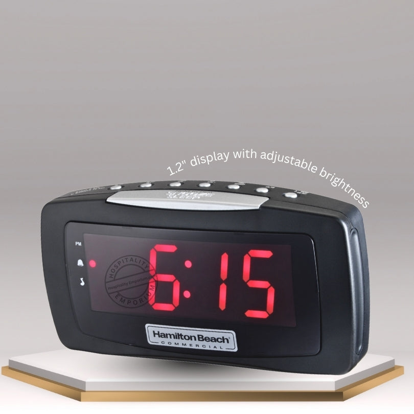 Los huéspedes de un hotel necesitan un despertador fácil de programar para despertarse por la mañana. El radio despertador para hostelería Hamilton Beach Commercial® ofrece una solución económica para despertarse, con una gran pantalla de 1,2 pulgadas con atenuación de luz y varias funciones adicionales. Cuando suena la alarma, se puede silenciar inmediatamente con el botón de repetición. Las opciones de radio AM y FM ofrecen entretenimiento de audio.