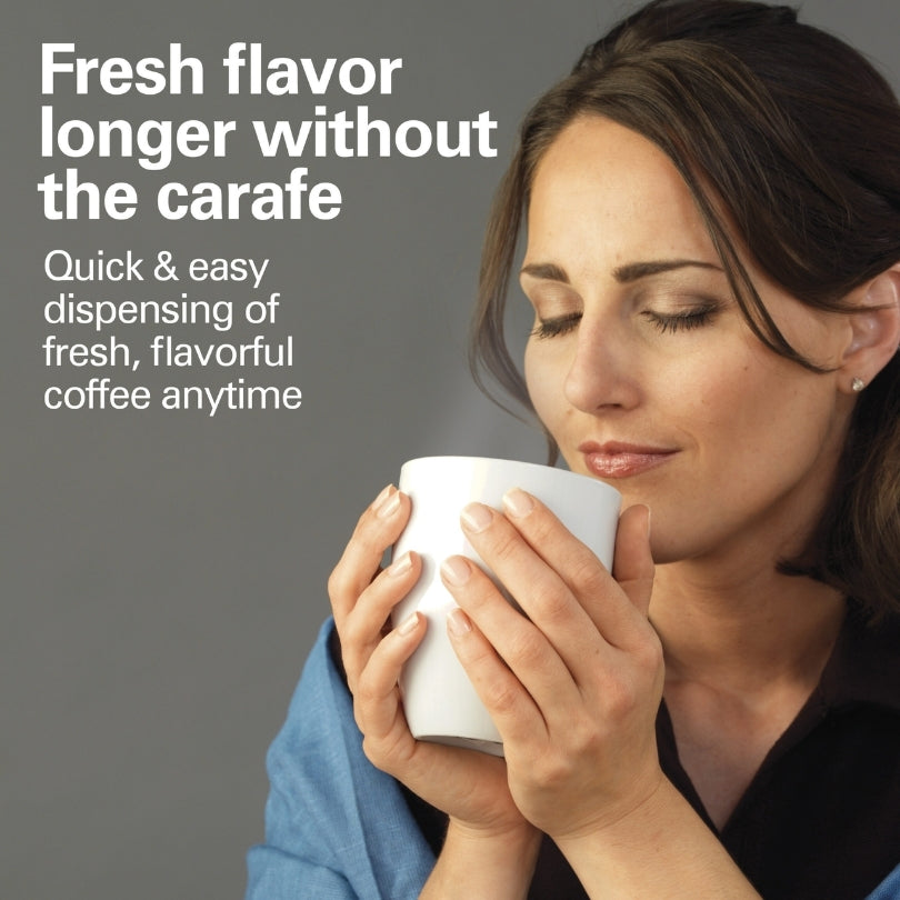 The result is fresh, tastier coffee for a longer period of time. The coffee maker dispenses hot or iced coffee directly into a cup or a travel mug whenever you’re ready. Just press the dispensing bar. The coffee maker brews 12 cups of coffee at a cup-a-minute rate and then keeps the coffee warm at just the right temperature for serving.