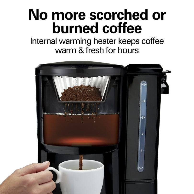 With the Hamilton Beach® 12 Cup Dispensing Coffee Maker, you can enjoy fresh flavorful coffee that’s ready whenever you want a cup. It works without a carafe, so you don’t have to worry about one more thing to clean, spill or break. The internal warming heater keeps the coffee warm and fresh hours after brewing.