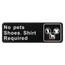 Ensure policy compliance with this "No Pets/Shoes and Shirt Required" Sign. Durable black sign clearly communicates requirements for entry.
