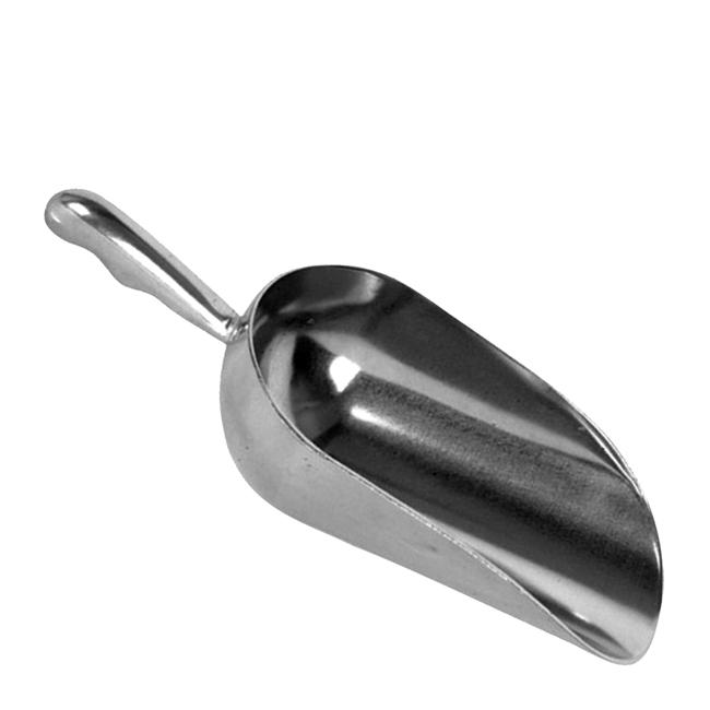 Durable, die-cast aluminum 12 oz. scoop, perfect for easily handling raw materials and dry ingredients like chemicals or soils. Features a sturdy, one-piece construction and a comfortable finger-grip handle.