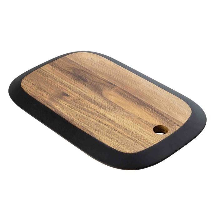 This 16x10.5 serving board features a sleek black edge, perfect for stylishly presenting appetizers, cheeses, or desserts.