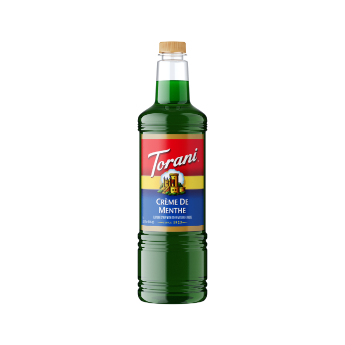 Add the crisp, minty coolness of Torani Crème de Menthe Flavoring Syrup to your specialty drinks, mochas, and desserts. This 1L bottle of vibrant emerald syrup is perfect for elevating your café's beverage offerings.