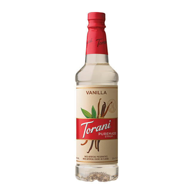 Torani Puremade Vanilla Syrup in a PET bottle is GMO-free, with no artificial flavors, colors, or preservatives, perfect for lattes, cold brew, and other beverages. Available in 750 mL (25.4 fl oz) size.
