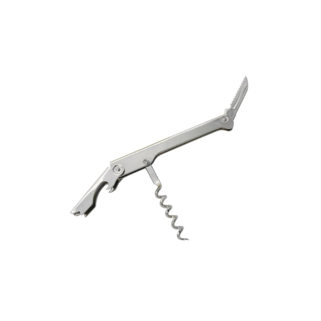 This compact, 3-in-1 Waiter's Corkscrew features durable stainless steel construction, a foil cutter, and a crown cap opener for effortless wine and bottle service.