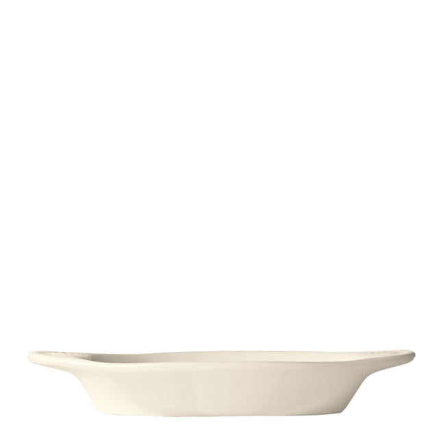 Durable World Tableware Bedrock Oval Welsh Rarebit ovenware in Cream White, perfect for serving rarebit, sides, or small entrees. This stoneware is dishwasher, freezer, microwave, and oven safe, offering versatility and long-lasting use in commercial kitchens or home settings.