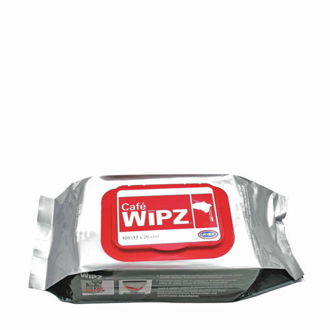 Pre-moistened, fragrance-free Urnex Café Wipz cleaning wipes for steam wands, bean hoppers, and countertops. Keep your coffee equipment spotless with this 100-count pack.