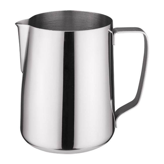This 50 oz. polished stainless steel frothing pitcher is perfect for creating rich, creamy foam for lattes and cappuccinos. Durable and easy to clean.