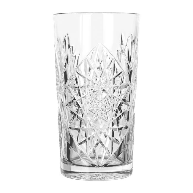 Serve mixed drinks, iced tea, or lemonade in the classic 16 oz Libbey Hobstar Cooler Glass. Featuring a decorative cut glass design and durable construction, this hi-ball glass is perfect for bar, restaurant, or home use. Its thick base helps resist chipping for long-lasting clarity.