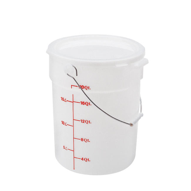 This durable, multi-purpose Cambro Pail with Bail (22 qt) is perfect for mixing, storing, or transporting. Made from stain-resistant, shatter-resistant polyethylene, this white 22-quart pail is dishwasher safe and withstands temperatures from -40°F to 160°F. Features easy-to-read external graduations, molded-in handles, and a removable bail handle for easy lifting. NSF certified.