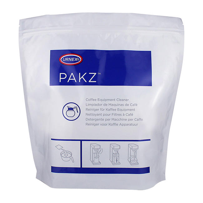 Effortlessly clean coffee brewers and servers with Urnex Pakz, the one-step, brew-in-place cleaning packet featuring a blue indicator dye for safe and efficient commercial use.