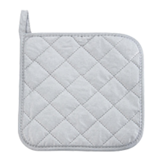 Professional quality 8" silver pot holder with heat-reflective finish and thick cotton padding, protecting up to 350° F. Features a nonstick, easy-to-clean silicone exterior.