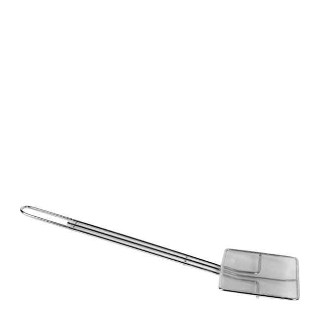 Durable 7-inch square skimmer with fine mesh for efficiently draining liquids, grease, and removing fried or boiled foods. Features a sturdy handle for safe use.