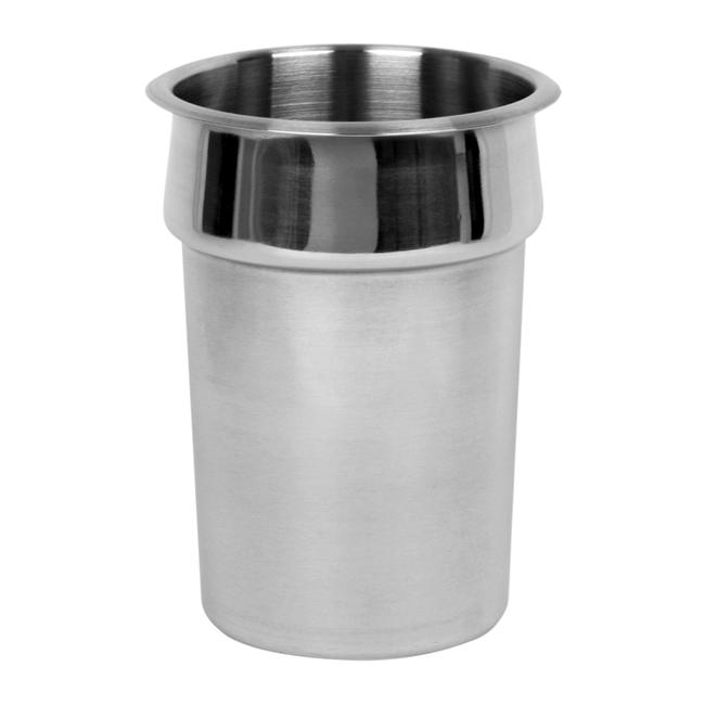 Durable 4 qt. round steam table inset. Polished stainless steel, ideal for soups and vegetables, fits a 6-1/2" opening.